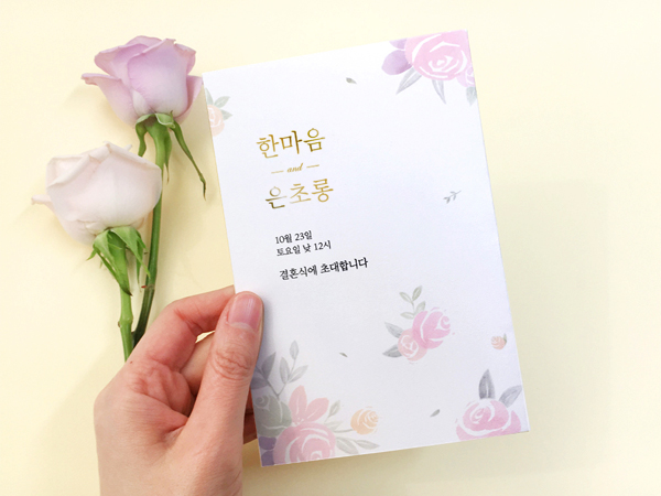 (컬러인쇄 필요 없으실 경우 "인사말, 성함, 약도/교통편"은 검정색 무료 인쇄됩니다) 핑크빛 보라빛이 어우러진 파스텔톤의 초대장입니다.