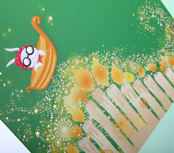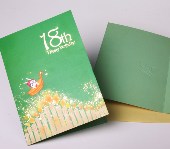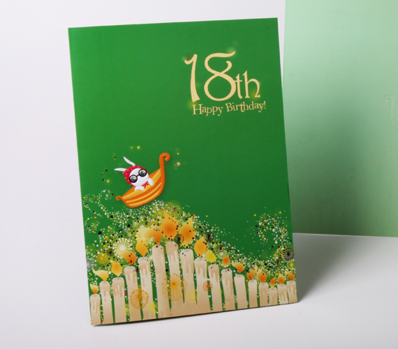 18세 생일 기념 축하카드입니다. 화려하게 타오르는 촛불이 은하수를 이루고 앙증맞은 토끼가 배를 타고 있는 디자인입니다. 금박가공으로 화려함과 가치를 더했습니다.