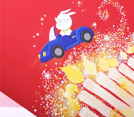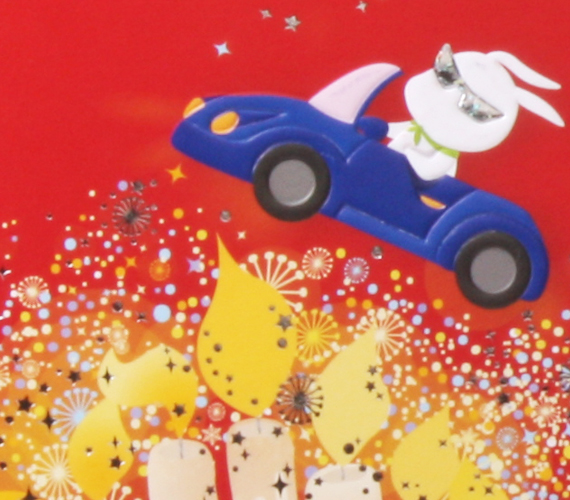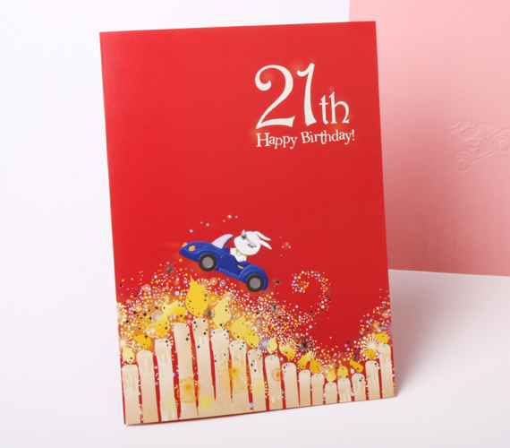 21세 생일 기념 축하카드입니다. 화려하게 타오르는 촛불사이로 멋진 스포츠카를 타고 달리는 토끼가 생일의 기쁨을 한층 더해주는 디자인 입니다. 화려한 은박가공으로 경쾌함을 느낄 수 있는 카드입니다.