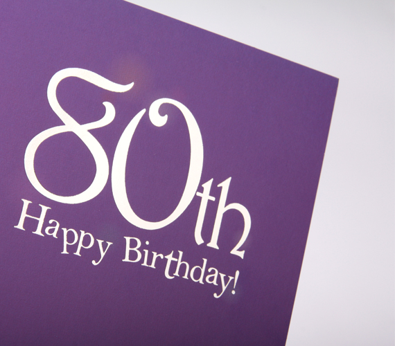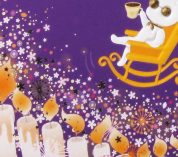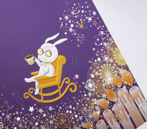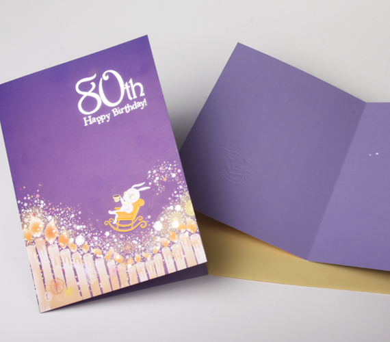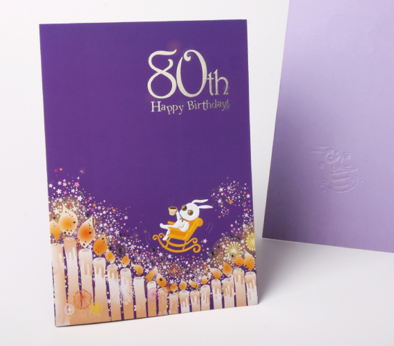 80세 생일기념 축하카드 입니다. 반짝거리는 촛불들 사이로 흔들의자에서 여유를 즐기는 토끼가 그려진 디자인입니다. 화려한 은박가공이 디테일을 더했습니다.