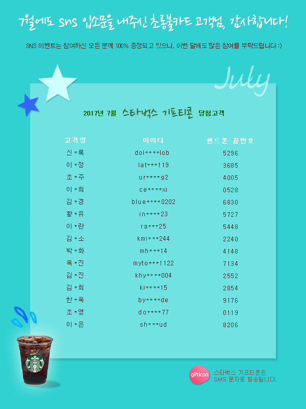 2017³â 7¿ù ¡Ú½ºÅ¸¹÷½º ±âÇÁƼÄÜ¡Ú ´ç÷ÀÚ ¸í´ÜÀÔ´Ï´Ù.