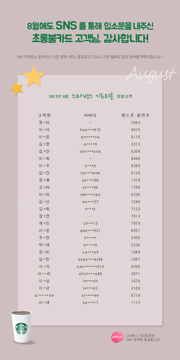 2017³â 8¿ù ¡Ú½ºÅ¸¹÷½º ±âÇÁƼÄÜ¡Ú ´ç÷ÀÚ ¸í´ÜÀÔ´Ï´Ù.
