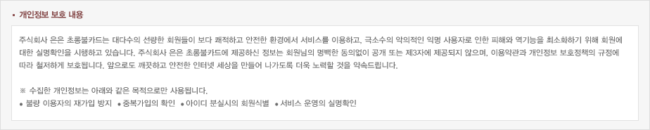 ÃÊ·ÕºÒ Ä«µå ¼îÇθô ÀÌ¿ë¾à°ü ***** Á¦1Àå ÃÑÄ¢ Á¦1Á¶ (¸ñÀû) ÀÌ ¾à°üÀº ÃÊ·ÕºÒÄ«µå(ÀÌÇÏ 'ÃÊ·ÕºÒ')¿¡¼ ¿î¿µÇÏ´Â ÀÎÅÍ³Ý »çÀÌÆ®ÀÎ ¡°www.chorongbul.co.kr¡±(ÀÌÇÏ '¸ô')ÀÇ ÀÌ¿ë°ú °ü·ÃÇÏ¿© »çÀ̹ö¸ô°ú ÀÌ¿ëÀÚÀÇ ±Ç¸®¡¤Àǹ« ¹× Ã¥ÀÓ»çÇ×À» ±ÔÁ¤ÇÔÀ» ¸ñÀûÀ¸·Î ÇÕ´Ï´Ù. Á¦2Á¶ (¾à°üÀÇ °øÁö ¹× º¯°æ) ¨ç ¡®ÃÊ·ÕºÒ¡¯Àº ÀÌ ¾à°üÀÇ ³»¿ë°ú »óÈ£ ¹× ´ëÇ¥ÀÚ ¼º¸í, ¿µ¾÷¼Ò ¼ÒÀçÁö ÁÖ¼Ò(¼ÒºñÀÚÀÇ ºÒ¸¸À» ó¸®ÇÒ ¼ö ÀÖ´Â °÷ÀÇ ÁÖ¼Ò¸¦ Æ÷ÇÔ), ÀüȹøÈ£, »ç¾÷ÀÚµî·Ï¹øÈ£, Åë½ÅÆÇ¸Å¾÷½Å°í¹øÈ£, °³ÀÎÁ¤º¸°ü¸®Ã¥ÀÓÀÚ µîÀ» ÀÌ¿ëÀÚ°¡ ½±°Ô ¾Ë ¼ö ÀÖµµ·Ï ¡®¸ô¡®ÀÇ Ãʱ⠼ºñ½ºÈ¸é(Àü¸é)¿¡ °Ô½ÃÇÕ´Ï´Ù. ´Ù¸¸, ¾à°üÀÇ ³»¿ëÀº ÀÌ¿ëÀÚ°¡ ¿¬°á ȸéÀ» ÅëÇÏ¿© º¼ ¼ö ÀÖµµ·Ï ÇÒ ¼ö ÀÖ½À´Ï´Ù. ¨è ¡®ÃÊ·ÕºÒ¡¯Àº ÀüÀÚ»ó°Å·¡ µî¿¡¼ÀÇ ¼ÒºñÀÚº¸È£¿¡ °üÇÑ ¹ý·ü, ¾à°üÀDZÔÁ¦¿¡ °üÇÑ ¹ý·ü, ÀüÀÚ°Å·¡±âº»¹ý, ÀüÀÚ¼¸í¹ý, Á¤º¸Åë½Å¸ÁÀÌ¿ëÃËÁø µî¿¡ °üÇÑ ¹ý·ü, ¹æ¹®ÆÇ¸Å µî¿¡ °üÇÑ ¹ý·ü, ¼ÒºñÀÚº¸È£¹ý µî °ü·Ã¹ýÀ» À§ÇØÇÏÁö ¾Ê´Â ¹üÀ§¿¡¼ ÀÌ ¾à°üÀ» °³Á¤ÇÒ ¼ö ÀÖ½À´Ï´Ù. ¨é ¡®ÃÊ·ÕºÒ¡¯ÀÌ ¾à°üÀ» °³Á¤ÇÒ °æ¿ì¿¡´Â Àû¿ëÀÏÀÚ ¹× °³Á¤»çÀ¯¸¦ ¸í½ÃÇÏ¿© ÇöÇà¾à°ü°ú ÇÔ²² ¸ôÀÇ Ãʱâȸ鿡 ±× Àû¿ëÀÏÀÚ 7ÀÏ ÀÌÀüºÎÅÍ Àû¿ëÀÏÀÚ ÀüÀϱîÁö °øÁöÇÕ´Ï´Ù. ´Ù¸¸, ÀÌ¿ëÀÚ¿¡°Ô ºÒ¸®ÇÏ°Ô ¾à°ü³»¿ëÀ» º¯°æÇÏ´Â °æ¿ì¿¡´Â ÃÖ¼ÒÇÑ 30ÀÏ ÀÌ»óÀÇ »çÀü À¯¿¹±â°£À» µÎ°í °øÁöÇÕ´Ï´Ù. ÀÌ °æ¿ì ¡®ÃÊ·ÕºÒ¡¯Àº °³Á¤ Àü ³»¿ë°ú °³Á¤ ÈÄ ³»¿ëÀ» ¸íÈ®ÇÏ°Ô ºñ±³ÇÏ¿© ÀÌ¿ëÀÚ°¡ ¾Ë±â ½±µµ·Ï ÇÕ´Ï´Ù. ¨ê ¡®ÃÊ·ÕºÒ¡¯ÀÌ ¾à°üÀ» °³Á¤ÇÒ °æ¿ì¿¡´Â ±× °³Á¤¾à°üÀº ±× Àû¿ëÀÏÀÚ ÀÌÈÄ¿¡ ü°áµÇ´Â °è¾à¿¡¸¸ Àû¿ëµÇ°í ±× ÀÌÀü¿¡ ÀÌ¹Ì Ã¼°áµÈ °è¾à¿¡ ´ëÇØ¼´Â °³Á¤ ÀüÀÇ ¾à°ü Á¶Ç×ÀÌ ±×´ë·Î Àû¿ëµË´Ï´Ù. ´Ù¸¸, ÀÌ¹Ì °è¾àÀ» ü°áÇÑ ÀÌ¿ëÀÚ°¡ °³Á¤¾à°ü Á¶Ç×ÀÇ Àû¿ëÀ» ¹Þ±â¸¦ ¿øÇÏ´Â ¶æÀ» Á¦3Ç׿¡ ÀÇÇÑ °³Á¤¾à°üÀÇ °øÁö ±â°£ ³»¿¡ ¡®ÃÊ·ÕºÒ¡¯¿¡ ¼Û½ÅÇÏ¿© ¡®ÃÊ·ÕºÒ¡¯ÀÇ µ¿ÀǸ¦ ¹ÞÀº °æ¿ì¿¡´Â °³Á¤¾à°ü Á¶Ç×ÀÌ Àû¿ëµË´Ï´Ù. Á¦3Á¶ (¾à°üÀÇ ÁØ¿ë) ÀÌ ¾à°ü¿¡¼ Á¤ÇÏÁö ¾Æ´ÏÇÑ »çÇ×°ú ÀÌ ¾à°üÀÇ ÇØ¼®¿¡ °üÇÏ¿©´Â ÀüÀÚ»ó°Å·¡µî¿¡¼ÀǼҺñÀÚº¸È£¿¡°üÇѹý·ü, ¾à°üÀÇ ±ÔÁ¦ µî¿¡ °üÇÑ ¹ý·ü, °øÁ¤°Å·¡À§¿øÈ¸°¡ Á¤ÇÏ´Â ÀüÀÚ»ó°Å·¡ µî¿¡¼ÀÇ ¼ÒºñÀÚº¸È£Áöħ ¹× °ü°è¹ý·É ¶Ç´Â »ó°ü·Ê¿¡ µû¸¨´Ï´Ù. Á¦4Á¶ (¿ë¾îÀÇ Á¤ÀÇ) ¨ç ÀÌ¿ëÀÚ(ȸ¿ø) : ÃÊ·ÕºÒÀÇ ¼ºñ½º ÀÌ¿ë°è¾àÀ» ü°áÇϰí ÀÌ¿ëÀÚ ¾ÆÀ̵ð(ID)¸¦ ºÎ¿©¹ÞÀº ÀÚ ¨è ¾ÆÀ̵ð(ID) : ȸ¿ø ½Äº°°ú ȸ¿øÀÇ ¼ºñ½º ÀÌ¿ëÀ» À§ÇÏ¿© ȸ¿øÀÌ ¼±Á¤Çϰí 'ÃÊ·ÕºÒ'ÀÌ ½ÂÀÎÇÏ´Â ¹®ÀÚ¿Í ¼ýÀÚÀÇ Á¶ÇÕ ¨é ºñ¹Ð ¹øÈ£ : ȸ¿øÀÇ Á¤º¸º¸È£¸¦ À§ÇØ È¸¿ø ÀÚ½ÅÀÌ ¼³Á¤ÇÑ ¹®ÀÚ¿Í ¼ýÀÚÀÇ Á¶ÇÕ ¨ê ¿î¿µÀÚ : ¼ºñ½ºÀÇ Àü¹ÝÀûÀÎ °ü¸®¿Í ¿øÈ°ÇÑ ¿î¿µÀ» À§ÇÏ¿© ÃÊ·ÕºÒ¿¡¼ ¼±Á¤ÇÑ »ç¶÷ ¨ë ÇØÁö : ȸ¿øÀÌ ÃÊ·ÕºÒ¿Í ¸ÎÀº ¼ºñ½º ÀÌ¿ë°è¾àÀ» ÇØ¾àÇÏ´Â °Í ***** Á¦ 2 Àå ¼ºñ½º ÀÌ¿ë°è¾à Á¦5Á¶ (ÀÌ¿ë°è¾àÀÇ ¼º¸³) ¨ç ÀÌ¿ë°è¾àÀº ÀÌ¿ëÀÚÀÇ ÀÌ¿ë½Åû°ú ÀÌ¿¡ ´ëÇÑ ÃÊ·ÕºÒÀÇ ½Â³«À¸·Î½á ¼º¸³ÇÕ´Ï´Ù. ¨è ¿Â¶óÀÎ ÀÌ¿ë½Åû ½Ã ¹°À½¿¡ "µ¿ÀÇÇÔ" ¹öưÀ» ´©¸£´Â °ÍÀº ÀÌ ¾à°ü¿¡ µ¿ÀÇÇÏ´Â °ÍÀ¸·Î °£Áֵ˴ϴÙ. Á¦6Á¶ (ÀÌ¿ë½Åû) ¨ç ÀÌ¿ë½ÅûÀº ¿Â¶óÀÎÀ¸·Î ÃÊ·ÕºÒ ¼ÒÁ¤ÀÇ °¡ÀÔ½Åû ¾ç½Ä¿¡¼ ¿ä±¸ÇÏ´Â »çÇ×À» ±â·ÏÇÏ¿© ½ÅûÇÕ´Ï´Ù. ¨è ¿Â¶óÀÎ °¡ÀÔ½Åû ¾ç½Ä¿¡ ±âÀçÇÏ´Â ¸ðµç ȸ¿ø Á¤º¸´Â ½ÇÁ¦ µ¥ÀÌÅÍÀÎ °ÍÀ¸·Î °£ÁÖÇÏ¸ç ½Ç¸íÀ̳ª ½ÇÁ¦ Á¤º¸¸¦ ÀÔ·ÂÇÏÁö ¾ÊÀº »ç¿ëÀÚ´Â ¹ýÀûÀÎ º¸È£¸¦ ¹ÞÀ» ¼ö ¾øÀ¸¸ç, ¼ºñ½º »ç¿ëÀÇ Á¦ÇÑÀ» ¹ÞÀ» ¼ö ÀÖ½À´Ï´Ù. Á¦7Á¶ (ÀÌ¿ë½ÅûÀÇ ½Â³«) ¨ç 'ÃÊ·ÕºÒ'Àº ÀÌ¿ëÀÚ°¡ Á¦6Á¶¿¡¼ Á¤ÇÑ ¸ðµç »çÇ×À» Á¤È®È÷ ±âÀçÇÏ¿© ÀÌ¿ë½ÅûÀ» ¿Ï·áÇÏ¿´À» ¶§´Â Áï½Ã ÀÌ¿ë½Åû¿¡ ´ëÇØ ½Â³«À» ÇÕ´Ï´Ù. ¨è 'ÃÊ·ÕºÒ'Àº ´ÙÀ½ °¢ È£ÀÇ 1¿¡ ÇØ´çÇÏ´Â ÀÌ¿ë½Åû¿¡ ´ëÇÏ¿© À¯º¸»çÀ¯°¡ ÇØ¼ÒµÉ ¶§±îÁö ±× ½Â³«À» À¯º¸ÇÒ ¼ö ÀÖ½À´Ï´Ù. 1) ¼ºñ½º»óÀÇ Àå¾Ö°¡ ¹ß»ýÇÑ °æ¿ì 2) ¼³ºñ¿¡ ¿©À¯°¡ ¾ø´Â °æ¿ì 3) ±âŸ 'ÃÊ·ÕºÒ'ÀÌ ÇÊ¿äÇÏ´Ù°í ÀÎÁ¤ÇÏ´Â °æ¿ì ¨é 'ÃÊ·ÕºÒ'Àº ´ÙÀ½ °¢ È£ÀÇ 1¿¡ ÇØ´çÇÏ´Â ÀÌ¿ë½Åû¿¡ ´ëÇÏ¿©´Â À̸¦ ½Â³«ÇÏÁö ¾Æ´ÏÇÒ ¼ö ÀÖ½À´Ï´Ù. 1) µî·Ï³»¿ë¿¡ ÇãÀ§, ±âÀç´©¶ô, ¿À±â°¡ ÀÖ´Â °æ¿ì 2) »çȸÀÇ ¾È³ç Áú¼ ¶Ç´Â ¹Ìdz¾ç¼ÓÀ» ÀúÇØÇÒ ¸ñÀûÀ¸·Î ½
